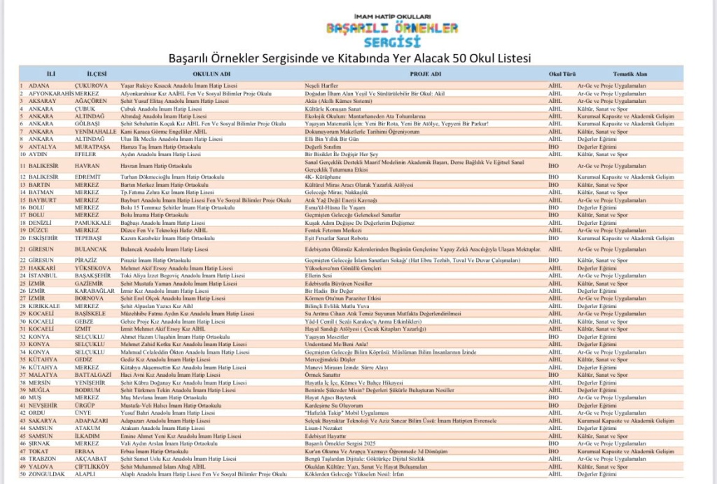 Okulumuz, Din Öğretimi Genel Müdürlüğü’nün düzenlediği İmam Hatip Okulları Başarılı Örnekler Sergisi’ne üst üste üçüncü kez seçilerek önemli bir başarıya daha imza attı. 5 Ağustos 2025’te açıklanan sonuçlara göre okulumuz, çevre ve sürdürülebilirlik temalı “Hayat Ağacı Bayterek” projesiyle Türkiye genelinde seçilen 50 okul arasına girdi.